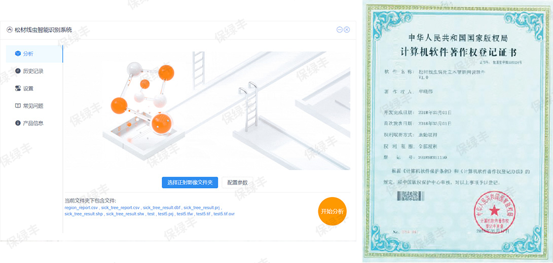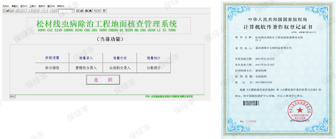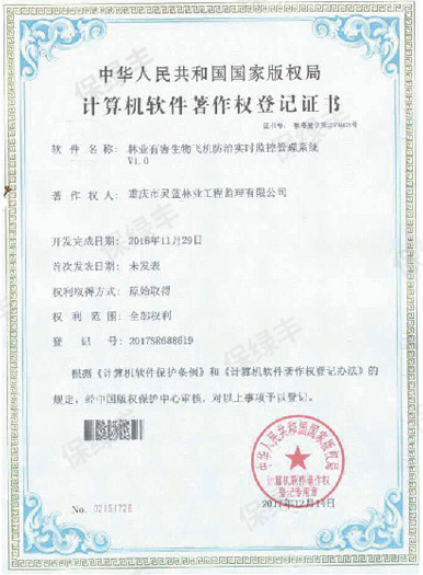 2015年重庆市灵蓝林业工程监理有限公司与成都天威科技有限责任公司,加强合作,联合开发出《林业有害生物飞机防治实时监控管理系统》。此系统旨在满足林业有害生物飞机防治作业实时监管与指挥平台,实现飞防作业飞行轨迹的科学规划、作业过程中飞行轨迹、施药状态与施药量的实时监测。同时对飞机进入禁飞区进行预警,切实持续有效地保障飞防作业质量。此系统分为三大子系统组成机载系统地面数据处理系统和飞防监控中心软件平台。目前本系统已在重庆、四川、云南、湖北、河南和新疆等6家通航公司20余架飞机装机,并完成相应的航空植保作业监管与统计,累计作业面积1200万亩次。